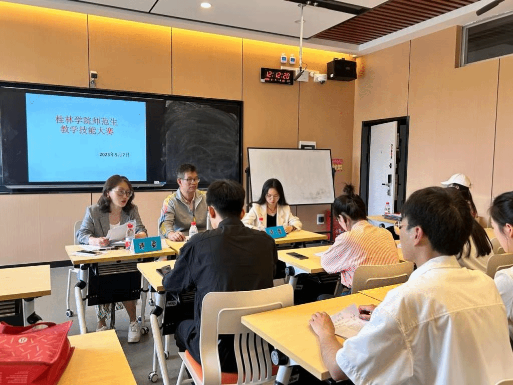 为进一步提升我校师范生的教师职业素养,落实“立德树人”根本任务,努力建设高质量教育体系,2023年5月7日星期一,桂林学院第八届师范生教学技能大赛暨2023年全区师范生教学技能大赛初高中语文组选拔赛顺利举行。本次比赛担任评委的是桂林市教科所副所长、语文特级教师韦海荣,桂林市清风实验学校科研处主任、语文特级教师吕玲,及我校潘冠海教授、陈桂成教授、曾强老师、朱秀群老师。