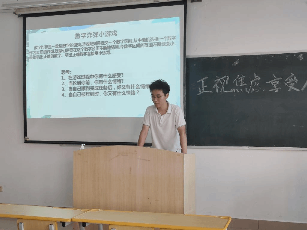 班会伊始,罗栩同学以“数字炸弹”游戏为导入,充分调动同学们的积极性,放松同学们的情绪。在游戏过程中,同学们结合自身学习的小语种进行互动分享。在游戏结束后,主持人向同学们提问了相关问题,比如:当自己被炸到或还没有轮到你或你顺利完成任务之后,你的感受是什么。该游戏既活跃了现场的气氛,也通过问题回答初步测试了同学们有没有出现焦虑的现象。