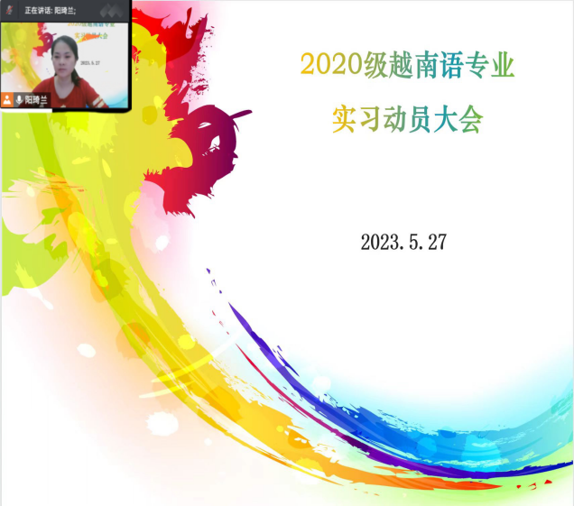 首先,阳琦兰对此次实习做了动员讲话,强调了全体2020级越南语专业学生须对本次实习高度重视,希望大家在实习过程中不断总结、反思在大学期间的得与失,同时调整好心态,迎接此次的实习。阳琦兰老师希望大家在接下来的实践活动中能够克服困难,同时注意人身安全,保证实习活动顺利进行。