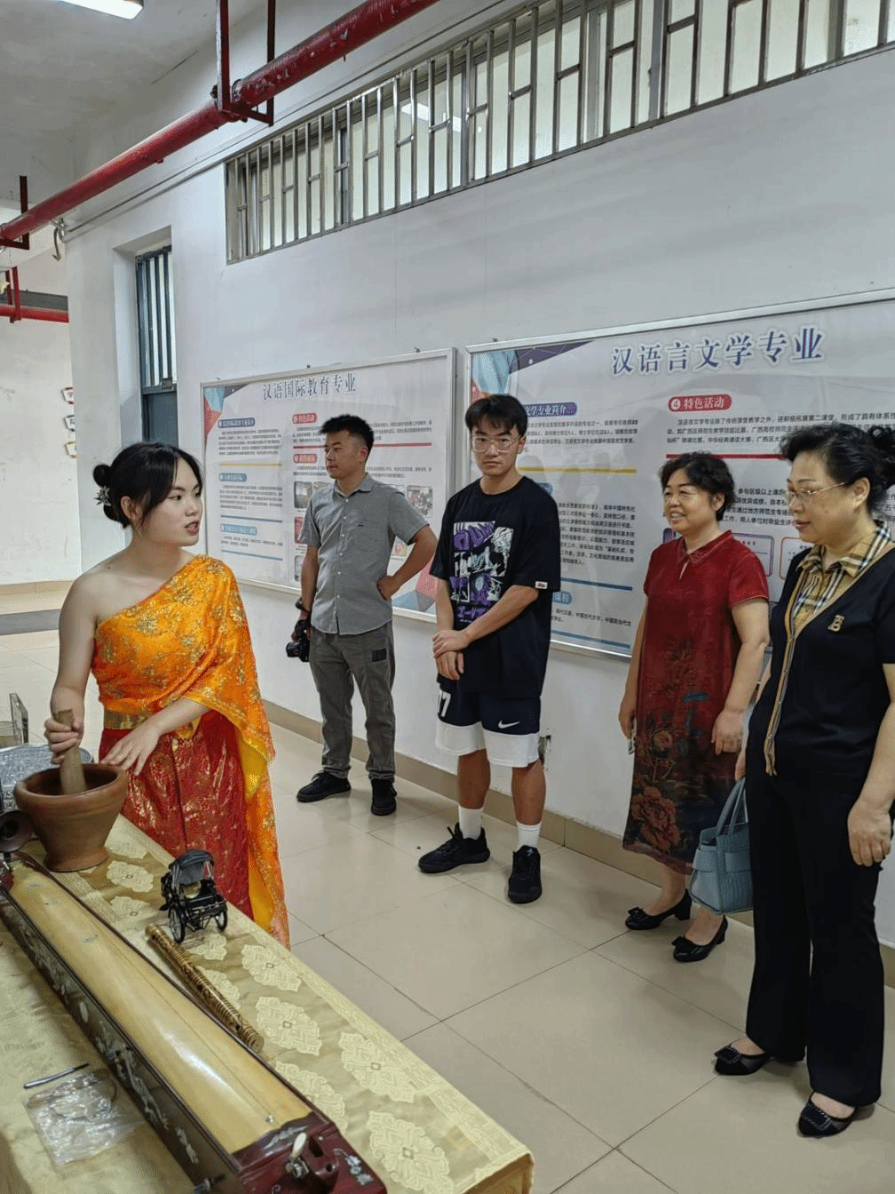 泰语、越南语专业负责人向在场领导介绍说,泰语、越南语专业注重培养理念的更新迭代,教学方法的与时俱进,既夯实学生的专业语言能力,也注重教授学生中国优秀传统文化、语言对象国优秀传统文化以及培养专业实践运用能力。2019年初,泰语专业教师团队和学生曾承接来自泰国5所高校42名留学生的汉语和中国文化专题的培训工作,收效良好,泰国教育部和国家电视台对此事进行了专门的报道。