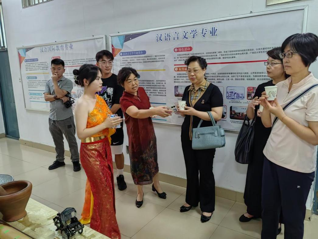 6月8日上午,桂林市政协提案委员会主任谢漓一行在桂林学院副校长何玲以及人文学院相关领导的陪同下,参观了人文学院越南语、泰语专业文化长廊,并详细调研和指导了我校泰语和越南语的专业建设和人才培养工作。
