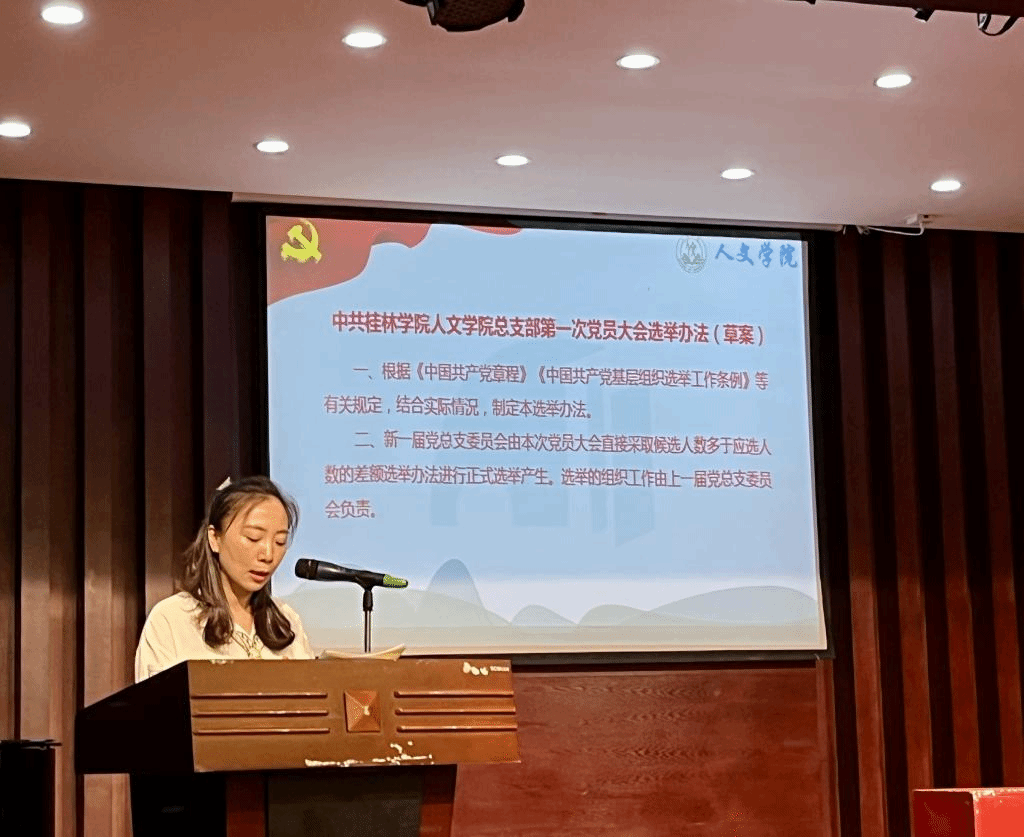 大会在庄严的国歌中开始。韦微向与会同志介绍了会议具体的议程,并宣读了学校党委《关于中共桂林学院人文学院总支部委员会委员候选人预备人选的批复》。