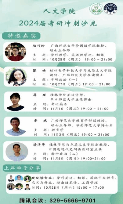 为积极助力学院2024届考研学子们全力备考,由人文学院主办,学院学研社承办的人文学院2024届考研冲刺沙龙系列专题讲座于10月25日晚启动,本次系列专题讲座从10月25日持续到11月5日,期间会邀请学科英语,教育学,政治,公共英语方面的专家进行多场专题解读,6位考取研究生的校友也会分享她们的考研心得。专题讲座首场“学科英语考研解析”特别邀请广西师范大学外国语学院硕士研究生导师陆巧玲教授为主讲嘉宾,讲座由学研社指导老师张佳敏主持。