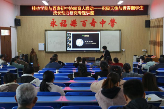 为全面贯彻党的教育方针,落实立德树人根本任务,培养德智体美劳全面发展的社会主义建设者和接班人,11月30日,人文学院赴永福县百寿初中、广福初中开展“积极天性与青春期学生成长动力研究”协同育人专题讲座。百寿初中校长黄富渊、广福初中校长卢开连分别主持讲座。两所学校全体教师、人文学院教授潘冠海及实习生参加讲座。讲座由人文学院教师刘浈主讲。