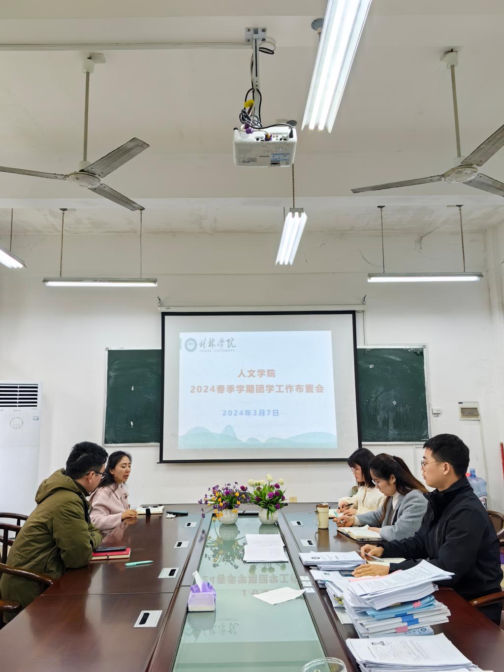 为推进新学期团学工作,明确本学期工作重点和方向,保障各项活动有效开展与落实,3月7日上午,人文学院在2108会议室召开2024年春季学期团学工作布置会,会议由学院党总支书记、副院长庞一飞主持,学院党总支副书记韦微、团总支书记、副书记参加本次会议。
