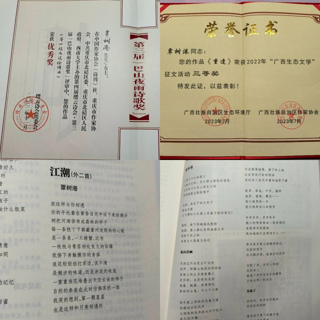 附:覃树港,2001年生人,来自广西梧州,桂林学院人文学院2020级汉语言文学专业学生,诗歌《江潮(外二首)》《花山壁画志(外六首)》等作品发表于《红豆》《野草》《西江月》《桂林晚报》等期刊;2023年诗歌《寄一段雨送绘缙云》在中国作家协会《诗刊》社、重庆市作家协会等组织主办的第四届缙云诗会·第三届“巴山夜雨诗歌奖”中获优秀奖;诗歌《重逢》获“广西生态文学”征文活动三等奖;另有作品被《广西文学》《南方文学》《当代•诗歌》《文学天地》等多家期刊留用。
