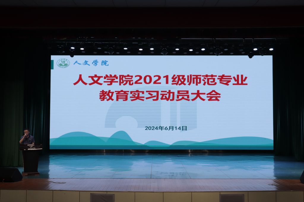 为切实提高学生的专业能力和师范素养,保障2024年秋季学期师范生实习工作顺利展开,人文学院于6月14日下午在弘善讲堂召开2021级师范专业教育实习动员大会。人文学院院长莫其逊、党总支书记庞一飞、副院长陈锴、党总支副书记韦微出席会议并讲话。实习指导教师、辅导员及2021级汉语言文学和英语专业学生参加会议。会议由副院长张超锋主持。
