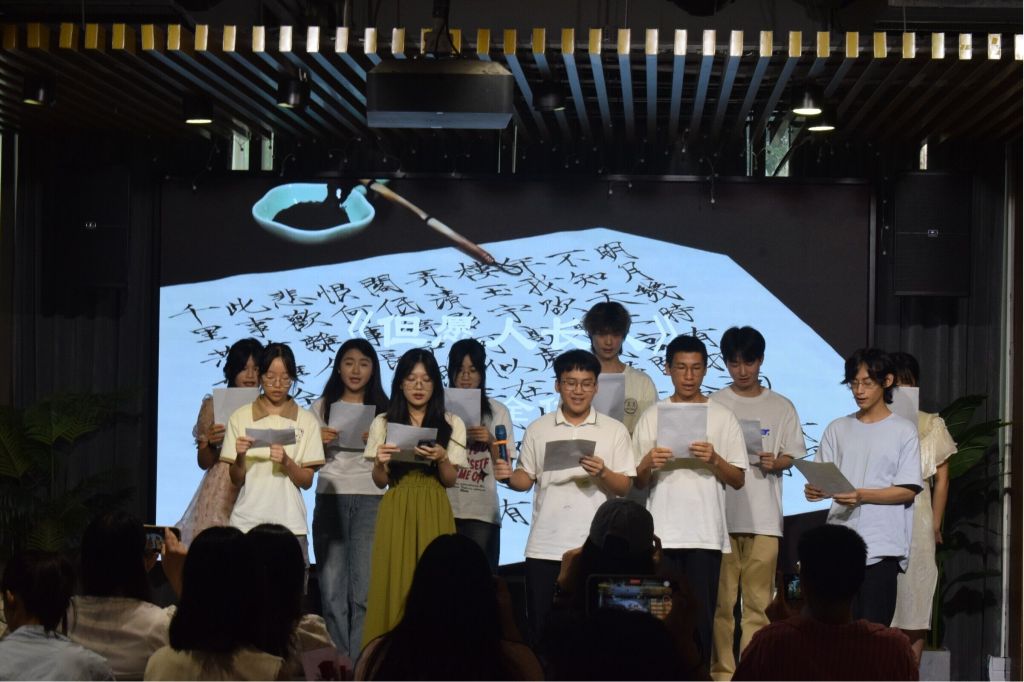 本次朗诵会分为三个环节:接龙组诗朗诵、个人诗歌朗诵和自由朗诵。在接龙组诗朗诵环节,现场观众积极参与,通过一人一句的形式,共同完成了基于大学四年时间线的组诗朗诵,展现了团队合作与创意的火花。个人诗歌朗诵环节则成为本次活动的亮点,多位朗诵者分享了自己的原创作品,如《外婆的油菜花》《童年的梦》等,每一首诗都承载着作者对童年纯真岁月的深切怀念与感悟。自由朗诵环节更是激发了现场诗人的创作热情,许多未报名的观众也勇敢地站上舞台,分享了自己的原创诗歌,将活动推向高潮。