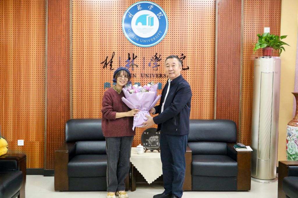黄芳向吴郭泉校长赠送此次获得骏马奖的作品《落下来》及其他个人作品,对学校给予的关心与支持表示衷心的感谢。黄芳表示会继续努力创作、认真工作,为学校发展不断贡献自己的力量。