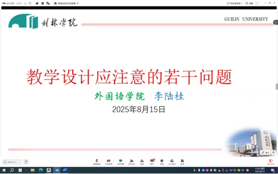 8月15日,外国语学院面向全院教师精心策划的教案规范化制定指导线上讲座如期举行。全院教师齐聚云端积极参与,本次讲座聚焦教案设计核心要点,为教师规范教案制定提供了极具实操性的指导方案。