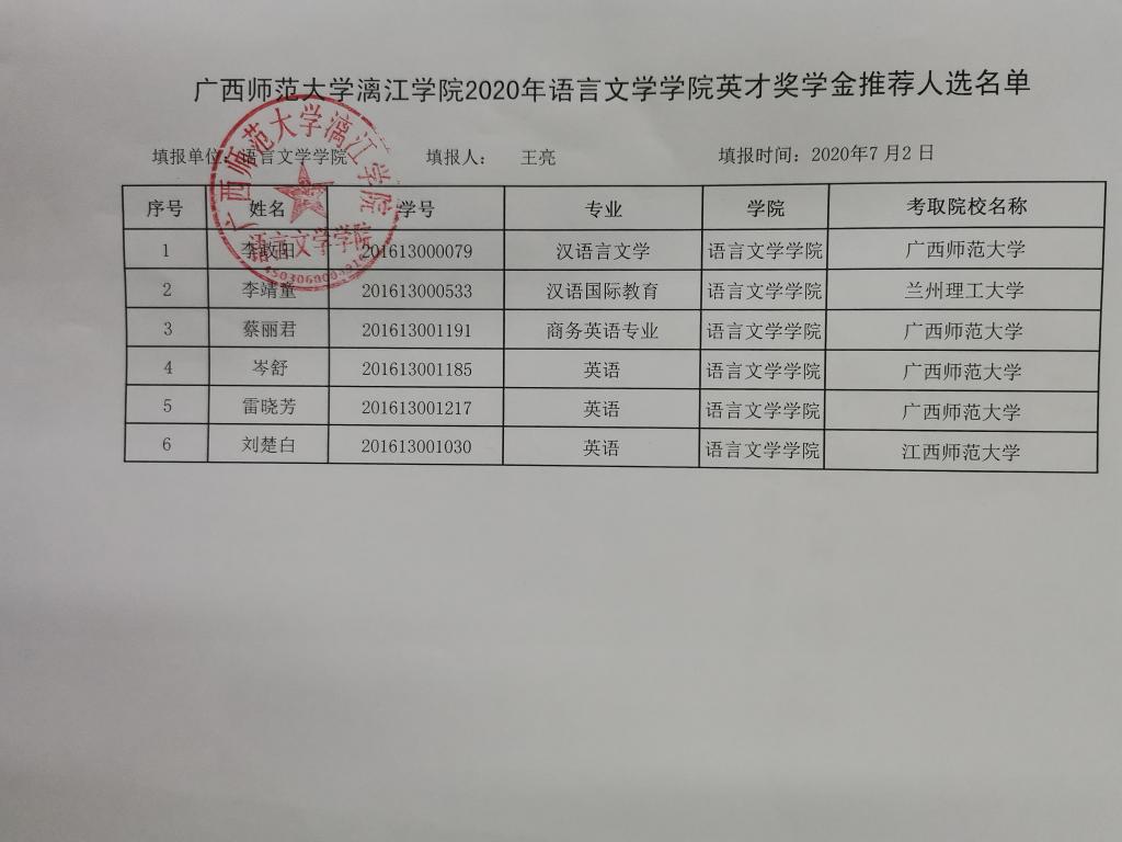 关于广西师范大学漓江学院2020年语言文学学院英才奖学金推荐人选的公示
