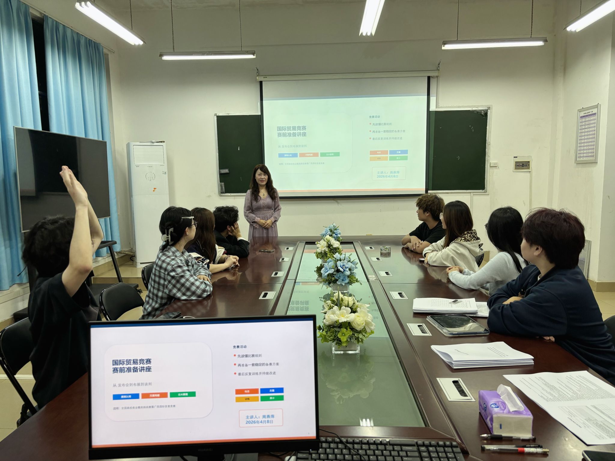 讲座紧扣国际贸易竞赛展会赛道的赛事标准,聚焦参赛核心环节精准指导。指导老师结合历届赛事经验,全面梳理比赛整体流程、评分重点及常见失分点,帮助学生明晰竞赛要求,提升备赛针对性。针对企业与产品展示、展位讲解、客户接待、商务洽谈等关键模块,老师详细拆解语言表达、职业形象、团队配合、临场应变等能力要求,引导学生从展示清晰度、表达得体性、逻辑连贯性、团队默契度等方面自查优化。