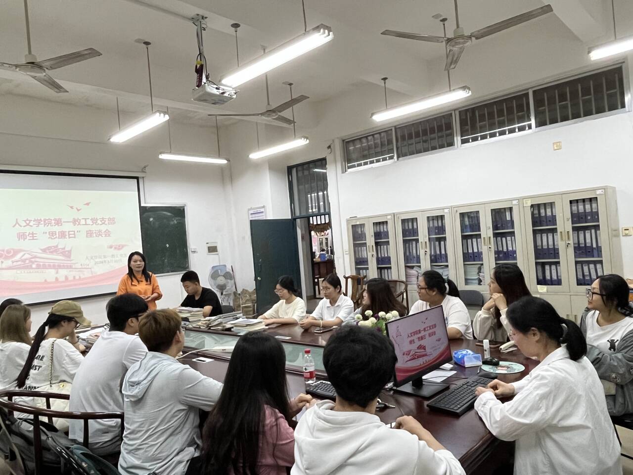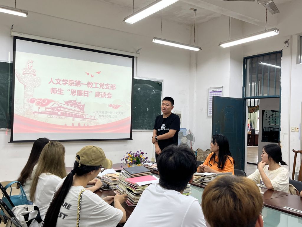5月10日下午,人文学院第一教工党支组织中文专业教师和学生代表在2108会议室开展“日日思廉,从我做起”为主题的师生“思廉日”座谈交流会,会上师生们纷纷为抓实抓紧抓好党风廉政建设各抒己见,献计献策。会议由第一教工党支部书记贺湘林主持。