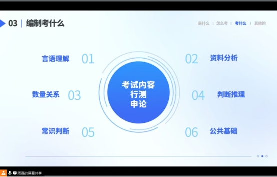 紧接着,周磊同学进行了关于编制考试的经验分享。主要是从编制考试是什么、怎么考、考什么等方面进行分享。针对编制考试是什么,周磊同学解释了事业编制的各项分类情况;关于怎么考,主要是以考试公告为切入点,帮助同学们抓好最佳备考时间,做好备考规划;对于考什么,他从言语理解、数量关系、常识判断等方面也做出了具体的经验分享,帮助同学们合理进行复习。