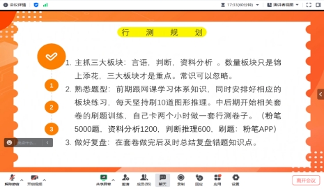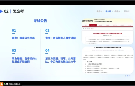 会议开始,主持人介绍了此次分享会邀请到的两位同学,随后两位同学针对考公和考编表达了自己的看法,并针对备考的方方面面,进行了经验分享。
