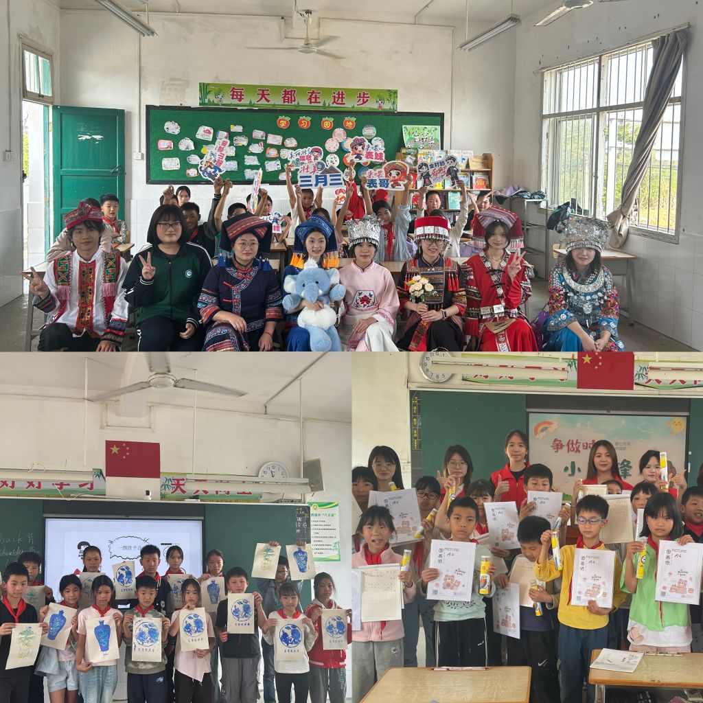 当天上午,志愿服务团队率先抵达大埠中心校联合教学点联合小学。活动分为两项内容同时开展,一是由人文学院带来的“笔锋励志·红心育苗” 雷锋故事宣讲。志愿者们通过绘声绘色的故事演讲带领学生走进真实的雷锋故事,助力学生理解“无私奉献、助人为乐、爱岗敬业”的雷锋精神,进而引导学生善于发现身边的“雷锋”。紧接着,学生认真书写关于雷锋的名言名句,让雷锋精神内化于心,外化于硬笔书法。二是由桂林博物馆带来的梅瓶版画的故事。由校语委朗诵队向学生介绍广西12个世居民族,并通过朗诵全国少数民族文学创作“骏马奖”获得者黄芳老师的《落下来》让学生感受现实点滴中的美,弘扬正能量并互动体验制作梅瓶版画,学生热情高涨,积极参与。