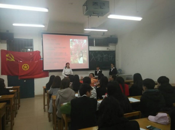 主持人宣读推优细则,全体起立奏国际歌和共青团团歌后,辅导员周老师上台讲话。紧接着,推选候选人依次上台发言。在此环节中,候选人诚挚地表达了自己入党的决心和努力的方向。各民主评议人也客观地在思想、学习、生活和工作等方面对候选人进行阐述,现场嘉宾及团员对候选人进行提问,各候选人均能真诚回答,并虚心听取嘉宾建议。经过紧张地不记名投票和公开唱票,两位候选人均顺利通过推优。最后,周老师为本次大会做了总结,她要求入党积极分子发挥模范带头作用,鼓励团员们积极进取,早日向党组织靠拢。