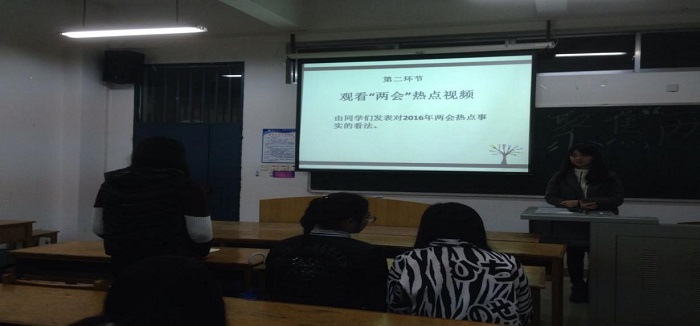 首先主持人向同学们两会的八个热点问题,为同学深入了解国家时事和两会内容奠定了基础。接着同学们观看两会热点视频,如司法体制的改革,创新驱动,绿色环保等与当今中国民众息息相关的热点话题,在观看视频后,同学们对2016两会热点话题积极发表了自己看法。最后班助袁丹学姐为本次的班会做总结,并对同学们未来的学习给予期望和建议。