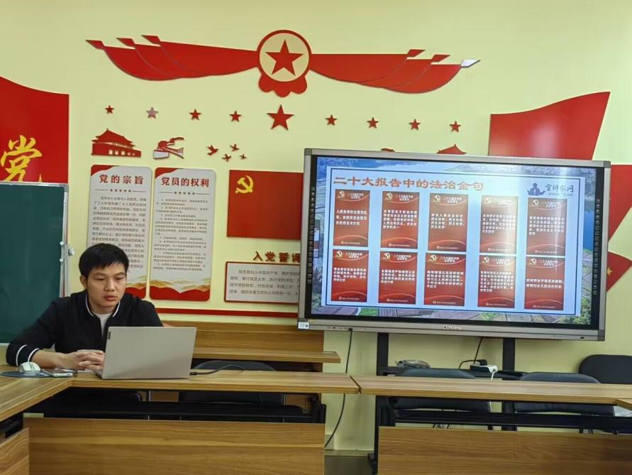为培养和造就社会主义事业接班人、加强党员队伍建设、筑牢红色战斗堡垒,传承习近平法治精神,2022年10月19日,语言文学学院第二学生党支部采用线下加线上的方式开展“全面准确学习领会习近平法治思想”主题党课,主讲人是语言文学学院党总支书记江仿。