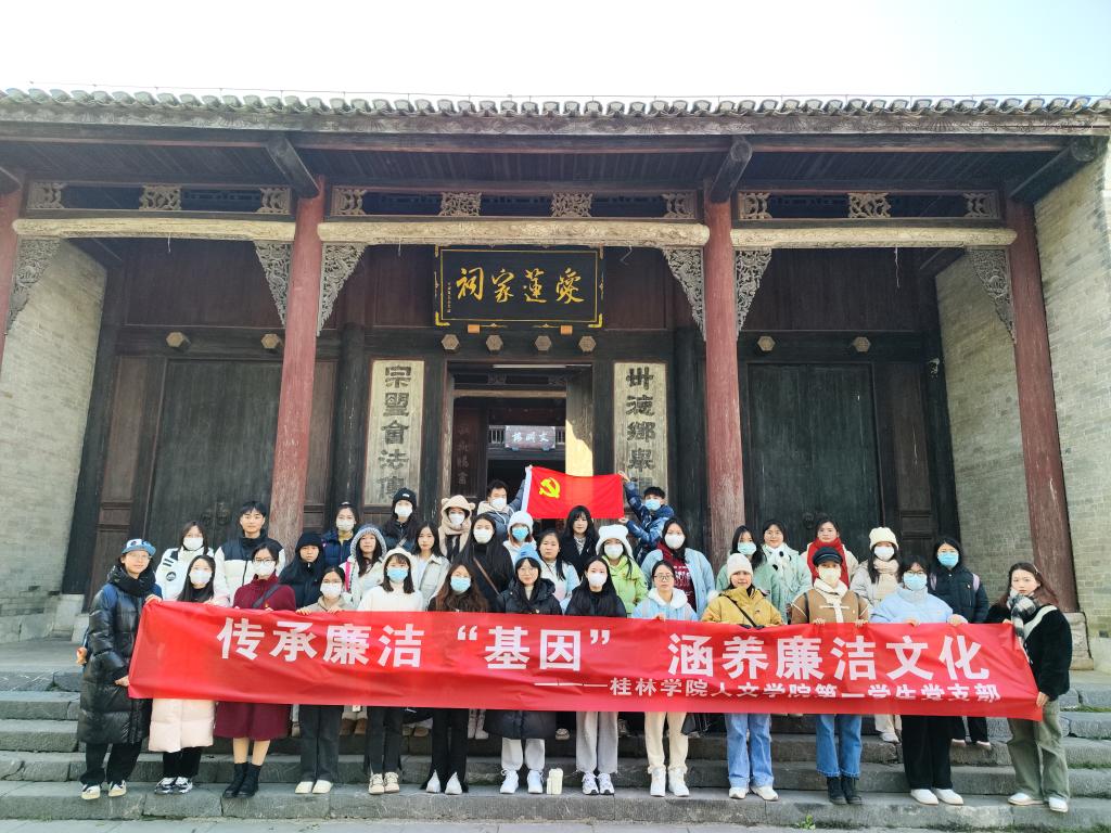 为深入学习贯彻习近平新时代中国特色社会主义思想和党的二十大精神,推进落实新时代廉洁文化建设的意见,以永远在路上的清醒和坚定,深化推进全面从严治党,持续推进党风廉政建设,12月22日,人文学院第一学生党支部组织支部全体党员、入党积极分子以及共青团员,到灵川县江头村爱莲家祠开展“传承廉洁‘基因’,涵养廉洁文化”主题党日活动。