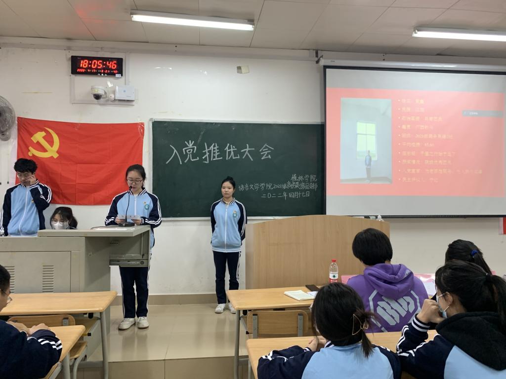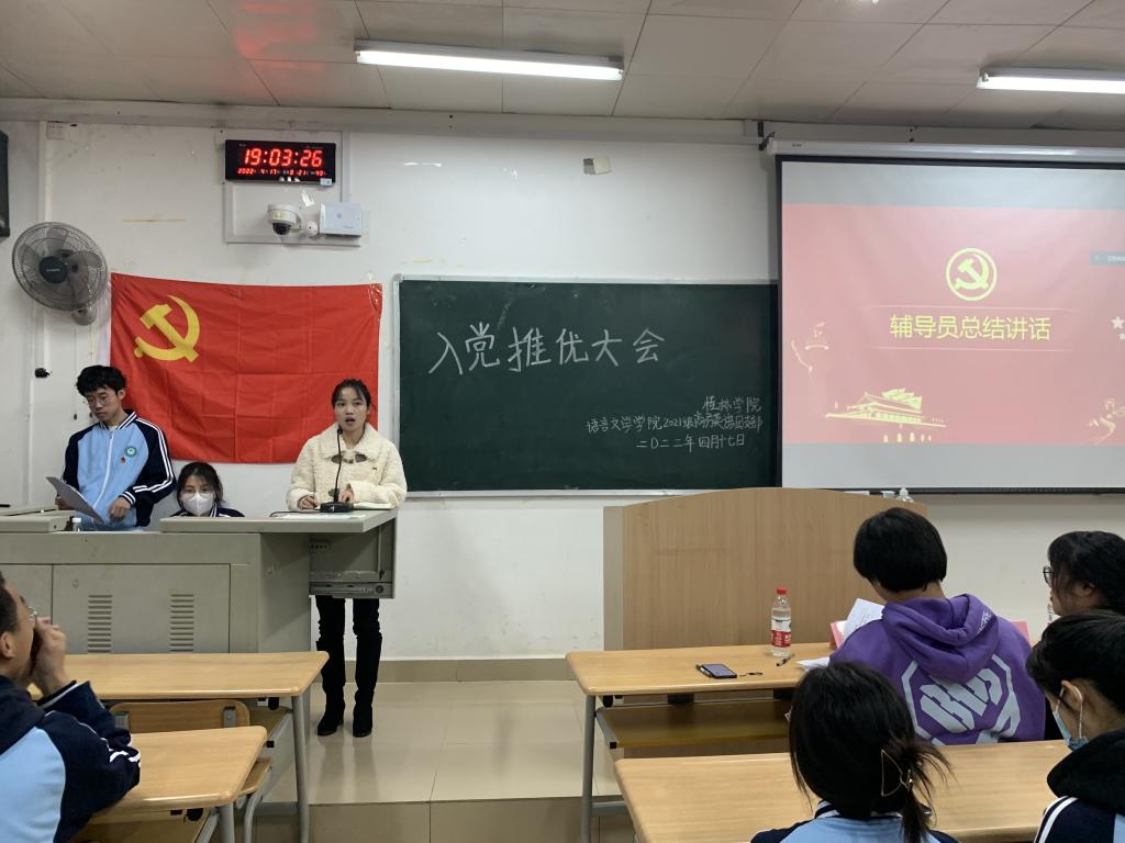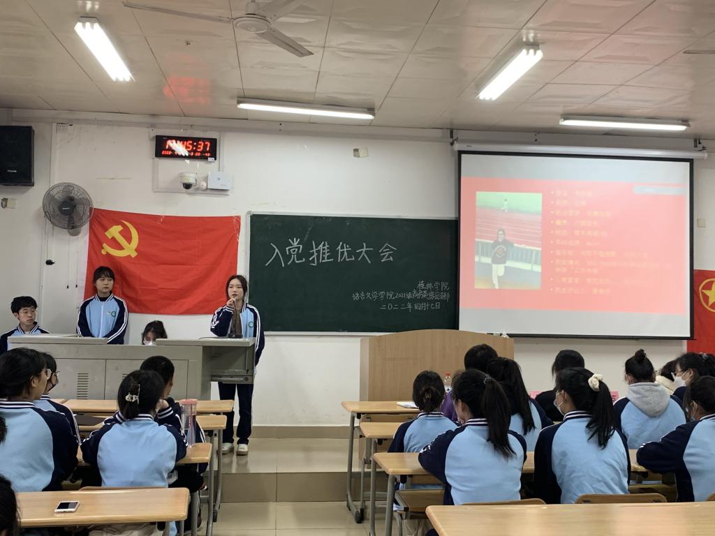 “推优”工作是党赋予共青团组织的一项光荣任务。为切实落实学校党建工作要求,推荐优秀团员向党组织靠拢,充实壮大党的后备力量,4月17日下午,语言文学学院2021级商务英语团支部在至善楼1408教室开展入党推优大会。会议由2021级商务英语团支部周浈尧、钱思宇主持,全体同学参加会议。