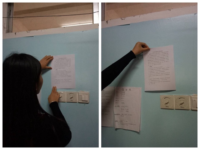 寝室是大学生学习、生活的重要组成部分之一,也是建立和谐的人际关系的基础,更是当代大学生素质的体现。拥有一个和谐、良好、文明的寝室氛围,是大学生学习、生活的保障。为了营造一个良好的学习氛围,加强学风建设,外语系学生第二党支部以榕湖家苑212寝室学生党员工作站为平台,宣传号召该年级所有同学加入大学生寝室文明公约活动。该活动主要围绕宿舍成员间沟通技巧、和谐相处,化解矛盾等几块女生公寓常见问题展开宣传,引起了同学们的热议。活动前期,工作站通过向全体同学收集意见整理完善寝室文明公约,在得出规范的公约后,212学生党员工作站所有成员积极认真对每个宿舍进行宣传,走进宿舍,帮助与各位同学了解、学习寝室文明公约。