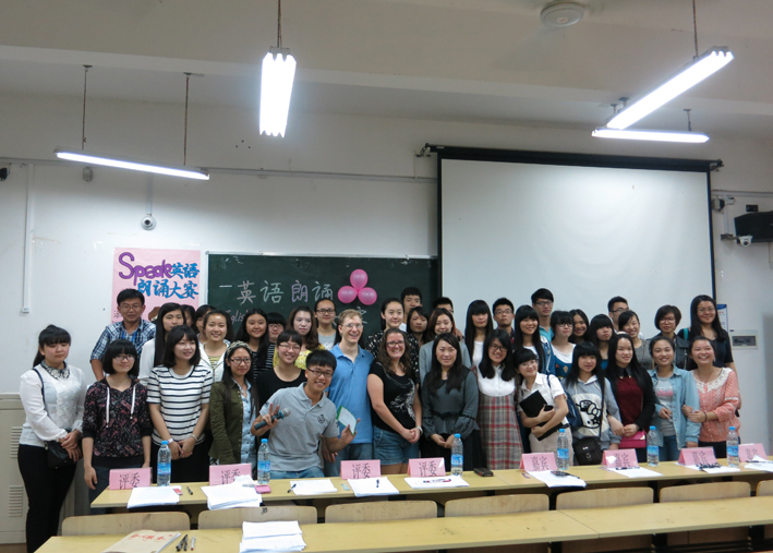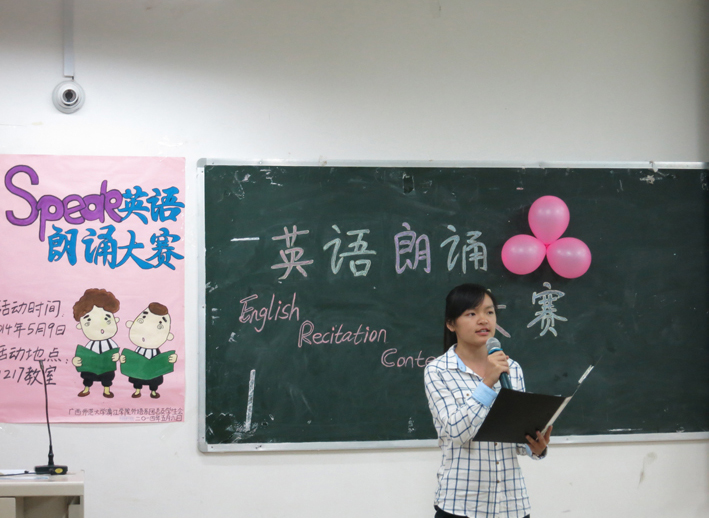 为了营造良好的学习氛围,使广大学生能增强口语能力及自信心,学会在读书中明志,在读书中寻找自己的方向, 2014年5月9日晚,“朗诵美文,读书志气”的英语朗诵比赛在1217教室举行。37名选手参加了比赛,由外语系周老师、梁老师、外教Matt和Elizabeth担任评委老师。本次活动为实验信息中心与外语系支部联合主办,外语系团学、弘毅读书社承办。