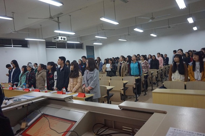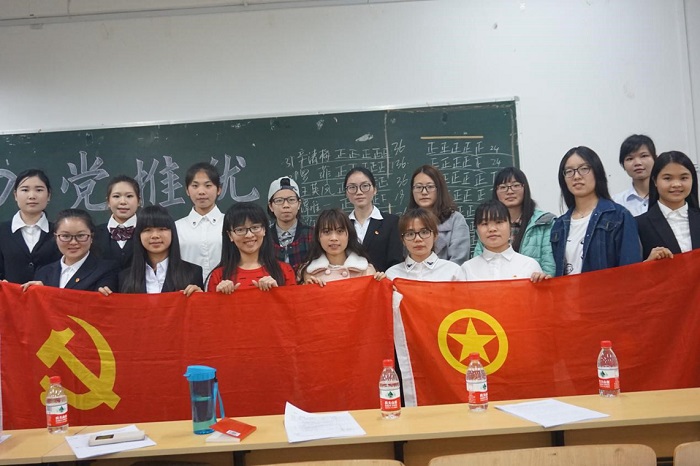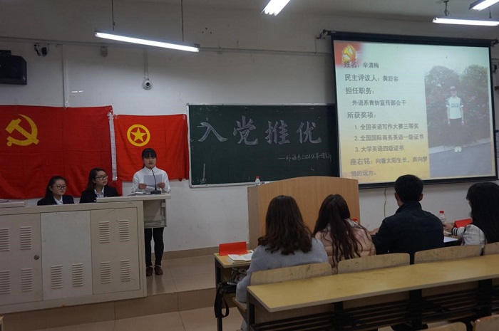全体起立奏唱《国际歌》、《共青团团歌》之后辅导员周俊巧老师上台发言,随后8位推优候选人先后到台上发表演讲,每一位上台的候选人都经过认真准备,真诚地向大家汇报思想、学习和生活等各方面的情况,各民主评议人对候选人也进行了客观、公正的评价。演讲结束后,经过紧张的不记名投票、唱票、统票后,8名表现优秀的团员顺获得了入党积极分子的光荣称号。