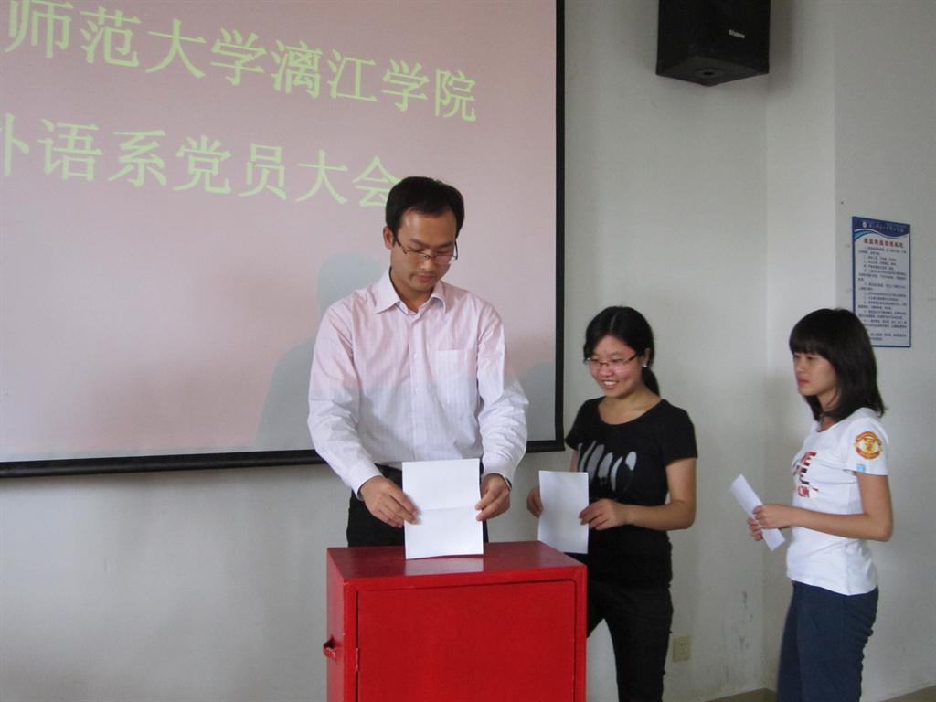 接下来会议审议并通过了外语系党总支换届选举大会选举办法,大会监票人、计票人名单,委员候选人预备人选名单。完成以上流程后,参会党员认真填写选票并依次进行了投票。由大会工作人员计票后向大会宣布选举结果,并产生了中共广西师范大学漓江学院外语系第二届总支部委员会。