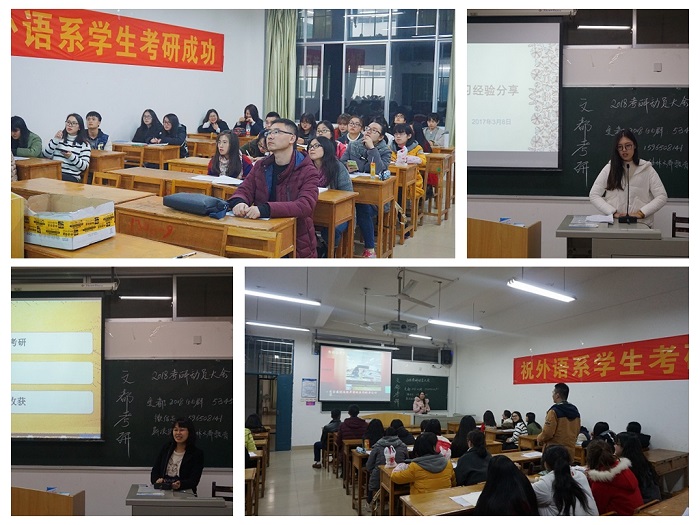首先,张超锋提出同学应该对未来进行进一步规划,希望同学们能够深化人生知识厚度,开阔人生视野。指出考研对于同学们也是一次人生的选择,人生的飞跃。李一枝为现场的同学们介绍她自己的考研经验,她点出为什么要考研,考研的方向,怎么去准备考研,以及一些考研收获以及就业情况。她所介绍的SWOT分析法:优势,劣势,机会,威胁,这对于同学们在考向研这条道路上指引了前进的方向。接着,蒋瑛在英语文学方面的考研进行了她的经验介绍,讲述了她的考研之路,她说考研需要勇气,在考研的道路上是会有很多困难,建议同学们能找一个考研战友,用信心、恒心、决心和平常心来积极面对考研,并祝愿同学们2018考研成功。随后,黄艳丽就英语课程与教学论的考研方向进行了介绍,指出同学们在复习专业课时,应该建立自己的复习体系,有步骤地去巩固自己的知识体系。然后两位今年通过初试的优秀学生向同学们分享了她们的跨专业的考研之路,从她们的考研之路看出,虽然考研的过程是艰苦的,但是当你得到你满意的分数时,一切都是值得的。