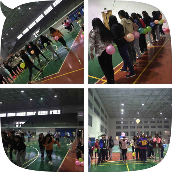 第一项游戏为“What's your name",意在让同学们在最短时间内牢记队友的名字、性格及爱好,增进同学间的交流。游戏过程中,有的小组因为激动而不停比划,抓狂跺脚,引发全场的连连爆笑;也有的组员火速憋气,复述队友所陈述的所有信息,用时短而取得可喜分数。游戏二为“What time is it now”,每组分别选出本组的“老狼”,其余为羊群。两组分别对赛。其中“TF girls”组由于男生优势,在对方的狼尚未警觉时率先跨到其身后成功戳破对方的气球,此时活动进入激烈角逐。最后一项为“follow me”,各组同时进行小组顶气球接力,“TF girls”组以最快的速度奔向终点,其他小组紧跟着陆续抵达。