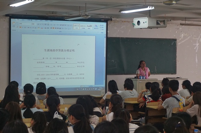 2016年9月23日下午2:30,001大教室举行讲解关于大学四年“奖助勤贷”的讲座,本次讲座的主讲人是周俊巧老师。
