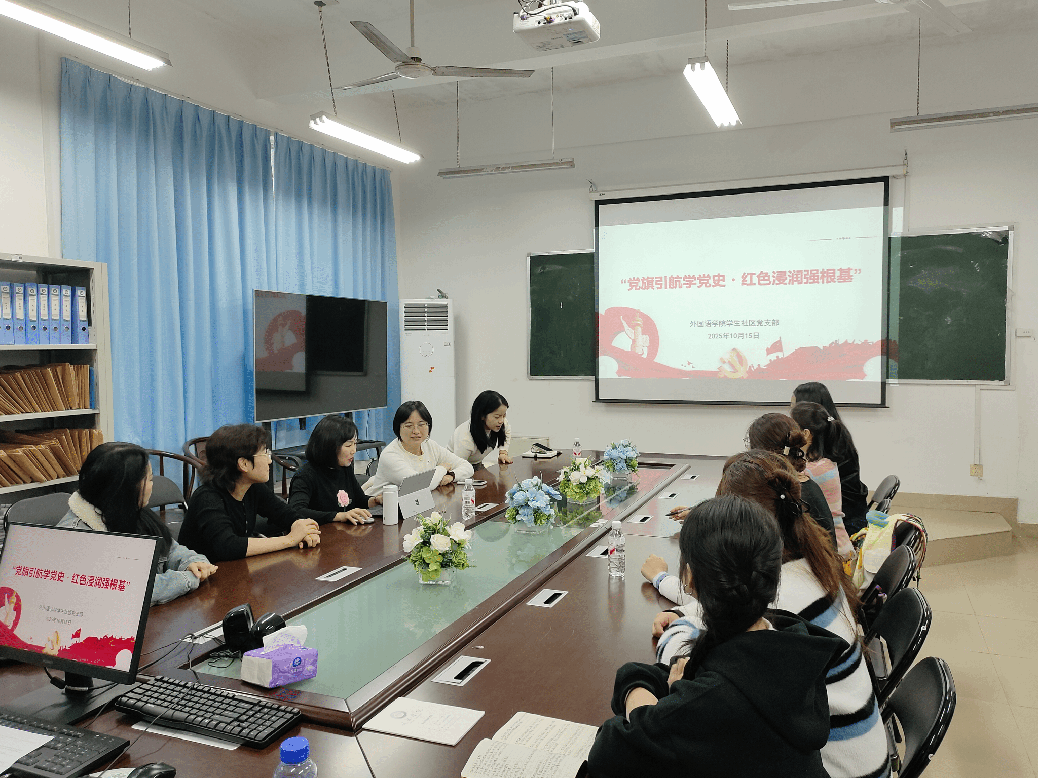 10月15日,外国语学院学生社区党支部以“党旗引航学党史・红色浸润强根基”为主题开展党日活动。通过奏唱国歌、党史影像观看、交流分享等沉浸式环节,引导支部党员在红色氛围中感悟初心、凝聚力量。