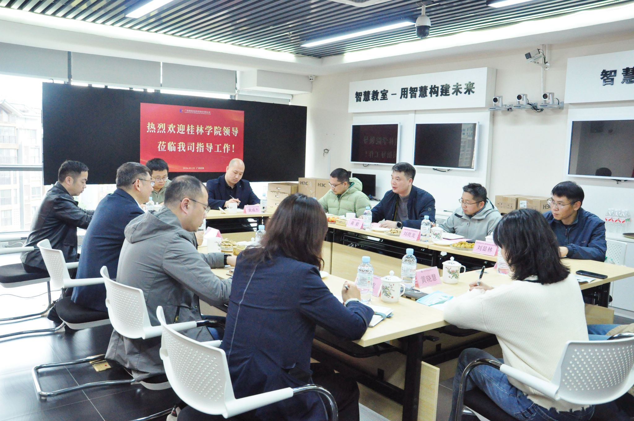 为深入推进访企拓岗促就业专项行动,深化产教融合、校企协同育人,精准对接企业用人需求,拓宽毕业生实习就业渠道,3月25日下午,学校党委委员、副校长蒋毅率信息工程学院班子成员及教师代表赴广西赛联信息科技股份有限公司开展定向访企拓岗专项行动。广西赛联信息科技股份有限公司总经理熊波携技术、售后、销售、产教融合等部门负责人共同座谈交流。