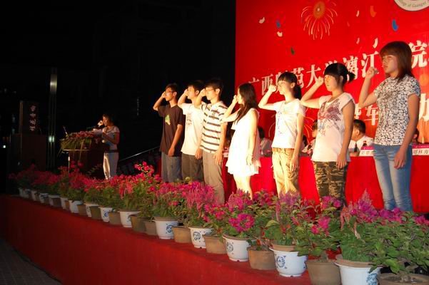09级新生代表也在发言中表示,他们对于未来四年的学习,充满了期待,充满了激情。他们会牢记“向学、向善、自律、自强”的校训,树立明确的目标,以往届精英为榜样,携手努力,刻苦学习,努力拼搏。随后,全体09级新生在领誓人的领誓下庄严宣誓。