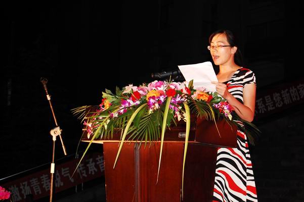 青年优秀教师、政法系黎瑛博士代表全体教师向09新生表达了热烈的欢迎,并劝勉新生:大学不是炫耀胜利的花环,而是化石为玉的丹炉;不是高枕无忧的驿站,而是秣马厉兵的营盘。黎瑛老师也对新同学们寄予了希望,希望他们尽快调整好自己的心态,开始大学生活;尽快转变学习方式,适应大学生活;学会与人相处的能力,享受大学生活。
