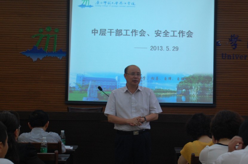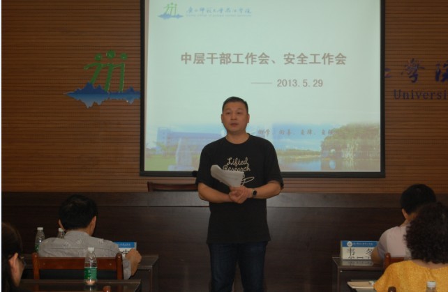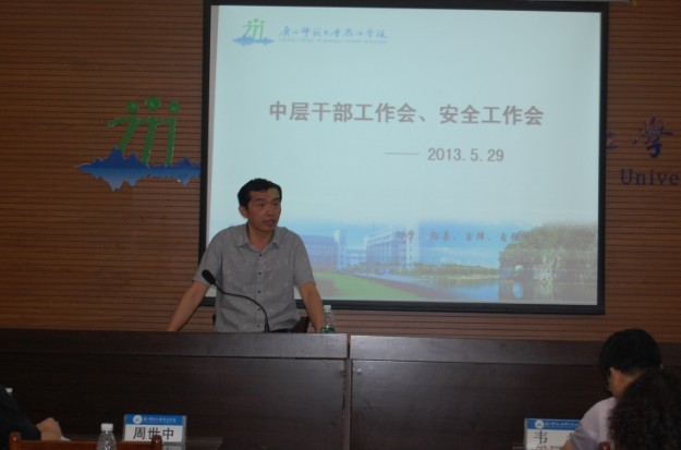 5月29日上午,学院中层干部工作会、安全工作会、学生就业推进会和宣传工作表彰会“四会合一”,简朴召开。学院领导蔡昌卓、周世中、韦冬、韦学韬、刘林海、章冬兰,学院全体中层干部参加了上述会议。党委副书记、副院长韦冬主持会议。