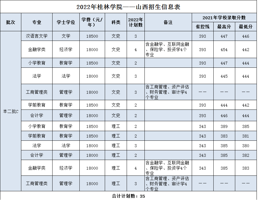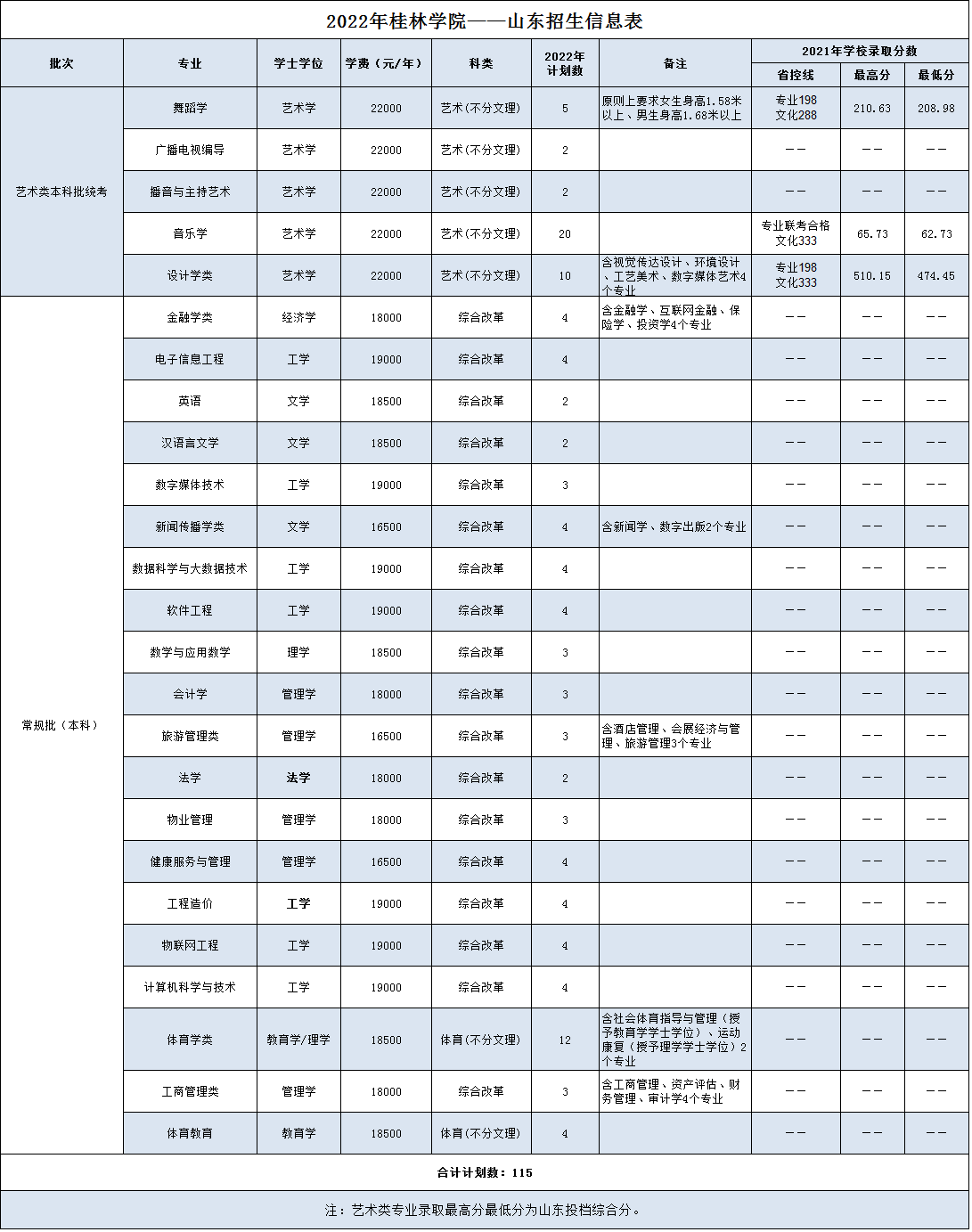 2022年普通高等教育分省分专业招生计划一览表 发布人: 发布时间:2022年06月23日 浏览次数: 桂林学院欢迎你的报考! 学校代码:13641 注:招生计划及计划安排以各省级招生办公布为准 广西 广东 云南 贵州 湖南 湖北 山东 河南 河北 江西 山西 陕西 吉林 新疆 江苏 天津 浙江 福建 内蒙古 海南 甘肃 安徽 联系方式 联系电话:0773—3696116 学校网址:http://www.gxljc.edu.cn 联系地址:广西桂林雁山区雁中路3号 邮政编码:541006 上一篇: 2023年普通高等教育分省分专业招生计划一览表(可下载附件) 下一篇: 桂林学院(原广西师范大学漓江学院)2021年分省分专业招生计划一览表