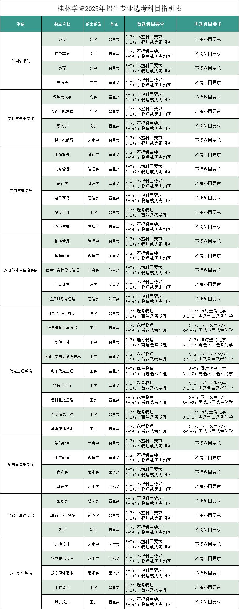 桂林学院2025年招生专业选考科目要求 发布人: 发布时间:2025年06月17日 浏览次数: 上一篇: 广西2025年普通高校招生政策百问百答 下一篇: 桂教考试〔2021〕3号自治区教育厅关于印发广西高考综合改革政策解读50问的通知